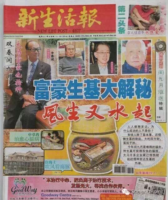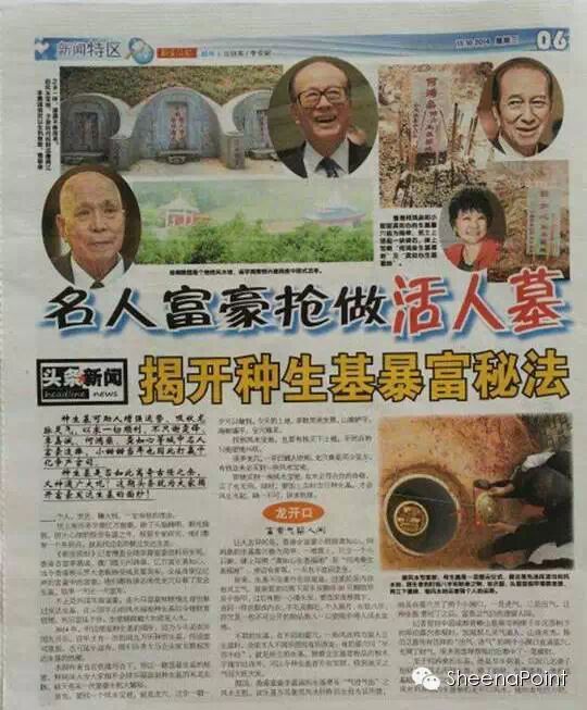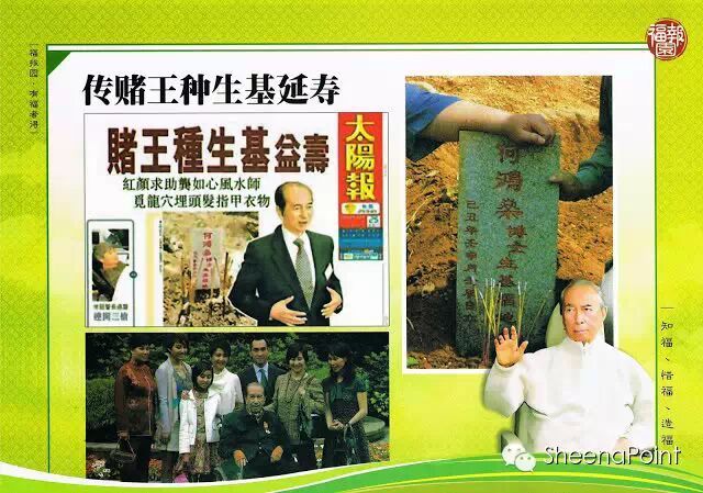在亚洲地区,不少人以种生基改运,有赌王何鸿燊、小甜甜 龚如心,娱乐圈的有汪明荃、谢霆锋、古巨基、杨千嬅、英 皇娱乐老板杨受成与他旗下艺人等,都做过生基,人人有山 坟墓碑,生人当死人拜。
