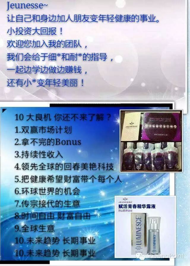 Online :wechat:Sheena_perfectbeuty 公众号:SheenaPoint Whatsup:0139838132如果您不想错过网商?您想了更快速的了解婕斯,我相信明年我一定是婕斯的钻石,我也相信缘分,只要我们有缘而且您也是真的想要通过婕斯改变自己的命运,我一定可以帮到您。欢迎您的咨询,我亲爱的朋友,让我们一起携手共创辉煌!很多名人在看懂婕斯之后, 都参与其中。电子商务互联网, 是一种趋势, 您看懂了吗?